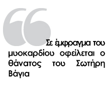 Φως στα αίτια του θανάτου του ηθοποιού Σωτήρη Βάγια, ο οποίος έφυγε αιφνιδίως χθες το απόγευμα για το μεγάλο ταξίδι, έριξε η νεκροψία-νεκροτομή που πραγματοποιήθηκε το πρωί της Πέμπτης στο Νεκροτομείο Αθηνών. Σύμφωνα με την ιατροδικαστή Σουλτάνα Μαριαννού, η οποία μίλησε στο zougla.gr, ο ηθοποιός απεβίωσε από έμφραγμα του μυοκαρδίου. Τα στοιχεία έδειξαν ότι έπασχε από χρόνια προβλήματα με την καρδιά του.