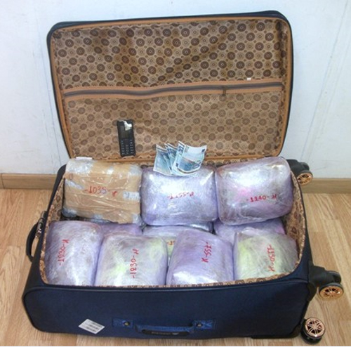 Από τον έλεγχο που διενεργήθηκε διαπιστώθηκε ότι μετέφερε στην αποσκευή του 16 νάιλον συσκευασίες, που περιείχαν την ακατέργαστη κάνναβη, οι οποίες είχαν εμποτισθεί με ουσία για την αποφυγή ανιχνεύσεως κατά τον αστυνομικό έλεγχο.