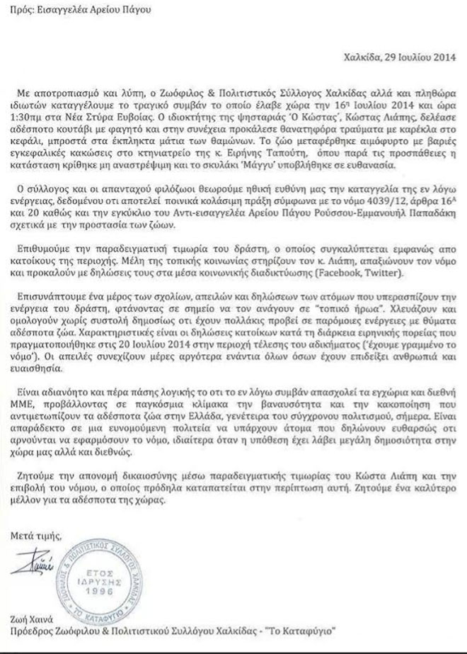 Σύμφωνα με την καταγγελία της προέδρου του Ζωόφιλου και Πολιτιστικού Συλλόγου Χαλκίδας προς τον εισαγγελέα του Αρείου Πάγου, ο δράστης, που δολοφόνησε τη μικρή Μάγκυ έξω από την ταβέρνα του, παραμένει ατιμώρητος και συγκαλύπτεται από κατοίκους της περιοχής, οι οποίοι μάλιστα τον ανάγουν σε τοπικό ήρωα και υπερασπίζονται με κάθε τρόπο την αποτρόπαια πράξη του.