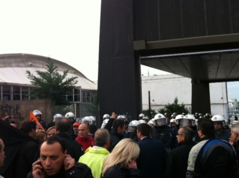 (Αστυνομικές δυνάμεις συγκρούονται με τους διαδηλωτές και δεν τους επιτρέπουν να εισέλθουν στο κτίριο)