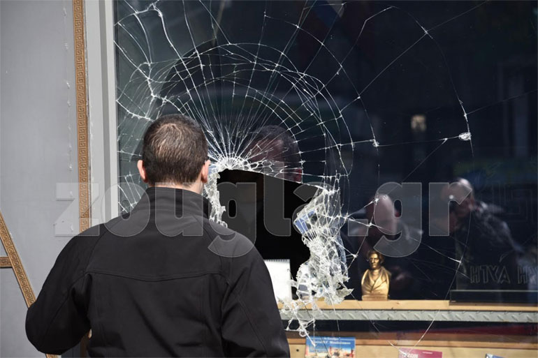 Σύμφωνα με πληροφορίες, άγνωστα άτομα, τα οποία φορούσαν κράνη και κουκούλες, εισέβαλαν στο βιβλιοπωλείο που βρίσκεται στο ισόγειο του κτηρίου και με βαριοπούλες έσπασαν τζαμαρίες και προκάλεσαν ζημιές, ενώ πέταξαν μπογιές.