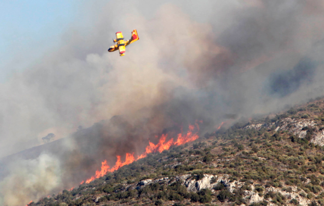 Από αέρος επιχείρησε στην αρχή ένα ελικόπτερο, ωστόσο, στη συνέχεια «σηκώθηκαν» δύο αεροπλάνα και ένα ακόμη ελικόπτερο, καθώς οι φλόγες πλησίαζαν επικίνδυνα κατοικίες. Πλέον επιχειρούν 10 αεροπλάνα και δύο ελικόπτερα.