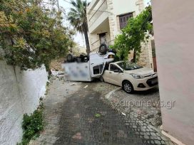Ένα φορτηγό-ψυγείο, ενώ ήταν παρκαρισμένο, έπεσε πάνω σε ένα παρκαρισμένο όχημα που βρισκόταν ακριβώς μπροστά, με αποτέλεσμα να τουμπάρει. Σύμφωνα με πληροφορίες, για άγνωστο λόγο λύθηκε το χειρόφρενο του φορτηγού.