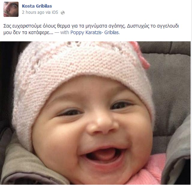 Δυστυχώς, όμως, πριν από λίγο, ο ίδιος έγραψε την τραγική είδηση του θανάτου της κορούλας του, ευχαριστώντας παράλληλα όλους θερμά για την συμπαράστασή τους.