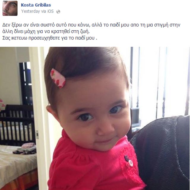 Συντετριμμένος ο δημοσιογράφος, ανακοίνωσε ο ίδιος μέσω facebook τα προβλήματα υγείας που αντιμετώπιζε η κόρη του και καλούσε τους φίλους του να προσευχηθούν μαζί του.