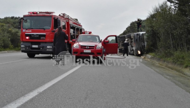 Επί τόπου έσπευσε κλιμάκιο της Πυροσβεστικής Υπηρεσίας. Το τροχαίο σημειώθηκε λίγο πριν από τις 10.00 το πρωί της Τρίτης. Το βαρύ όχημα εξετράπη από την πορεία του κάτω από αδιευκρίνιστες συνθήκες και συγκρούστηκε με διερχόμενο Ι.Χ., πριν ανατραπεί.