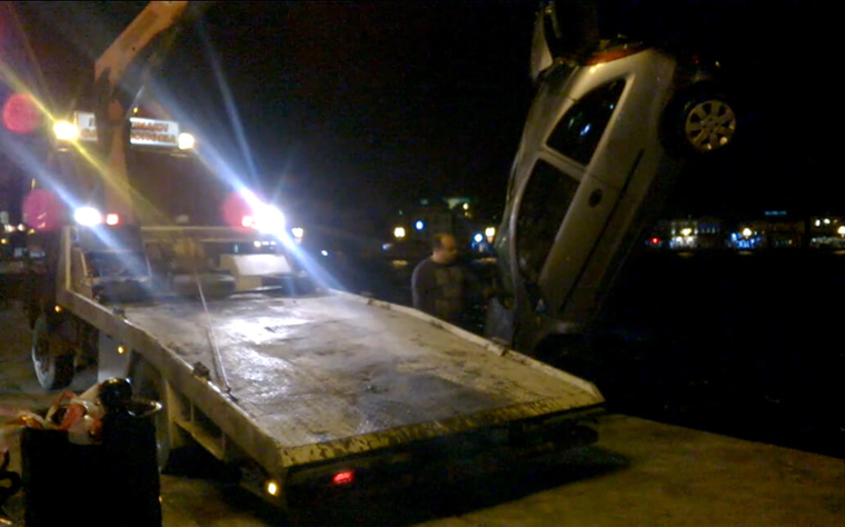 Λίγα μέτρα από το παλιό δημαρχείο, στο ύψος του ιστορικού καφενείου «Πανελλήνιον» στην προκυμαία, ένα αυτοκίνητο που κατευθυνόταν με μεγάλη ταχύτητα από την πλατεία Σαπφούς προς το Δημοτικό Θέατρο, πέρασε στο αντίθετο ρεύμα κυκλοφορίας, ανέβηκε στο διπλό κράσπεδο του πεζοδρομίου και βούτηξε στη θάλασσα, αφού προηγουμένως προσέκρουσε σε παρακείμενο μεταλλικό αλιευτικό σκάφος.