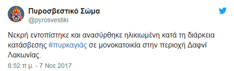 Νεκρή ανασύρθηκε μια ηλικιωμένη γυναίκα ύστερα από πυρκαγιά που ξέσπασε στη μονοκατοικία όπου διέμενε στο Δαφνί Λακωνίας, στη Σπάρτη.