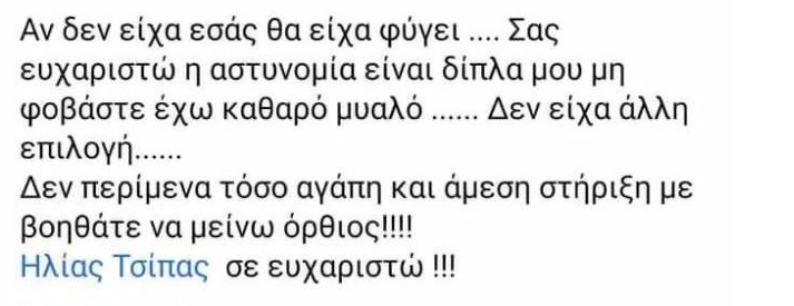 «Αν δεν είχα εσάς θα είχα φύγει …. Σας ευχαριστώ η αστυνομία είναι δίπλα μου μη φοβάστε έχω καθαρό μυαλό …… Δεν είχα άλλη επιλογή…… Δεν περίμενα τόσο αγάπη και άμεση στήριξη με βοηθάτε να μείνω όρθιος!!!! Ηλία Τσίπα σε ευχαριστώ !!!».