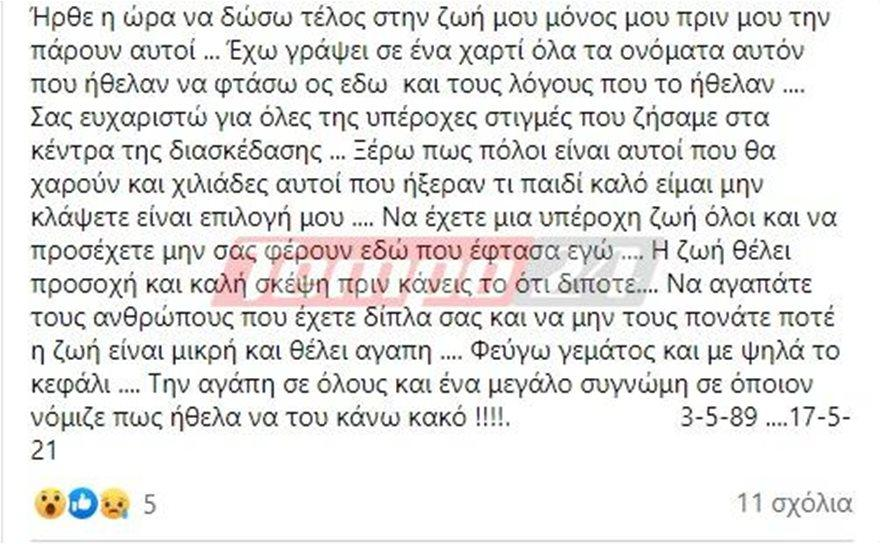 Χαρακτηριστικά έγραψε στο facebook: «Ήρθε η ώρα να δώσω τέλος στη ζωή μου μόνος μου πριν μου την πάρουν αυτοί … Έχω γράψει σε ένα χαρτί όλα τα ονόματα αυτών που ήθελαν να φτάσω ως εδω και τους λόγους που το ήθελαν …. Σας ευχαριστώ για όλες τις υπέροχες στιγμές που ζήσαμε… Ξέρω πως πόλλοι είναι αυτοί που θα χαρούν και χιλιάδες αυτοί που ήξεραν τι παιδί καλό είμαι, μην κλάψετε είναι επιλογή μου …. Να έχετε μια υπέροχη ζωή όλοι και να προσέχετε μην σας φέρουν εδώ που έφτασα εγώ …. Η ζωή θέλει προσοχή και καλή σκέψη πριν κάνεις το οτιδήποτε…. Να αγαπάτε τους ανθρώπους που έχετε δίπλα σας και να μην τους πονάτε ποτέ η ζωή είναι μικρή και θέλει αγάπη …. Φεύγω γεμάτος και με ψηλά το κεφάλι …. Την αγάπη σε όλους και ένα μεγάλο συγνώμη σε όποιον νόμιζε πως ήθελα να του κάνω κακό !!!!».