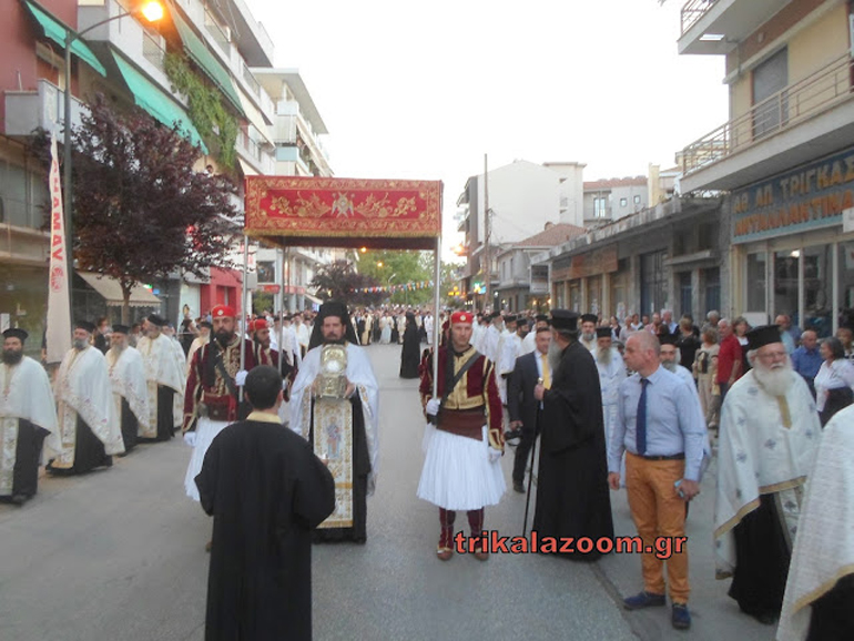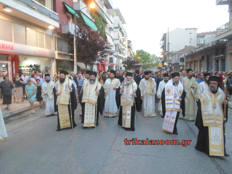 Χθες το βράδυ στις 8.30, ξεκίνησε η λιτανεία της Τιμίας Κάρας και της Ιερής Εικόνας του Αγίου Βησσαρίωνα προς την κεντρική πλατεία Τρικάλων, για την τέλεση Αρτοκλασίας και Θείου Κηρύγματος.