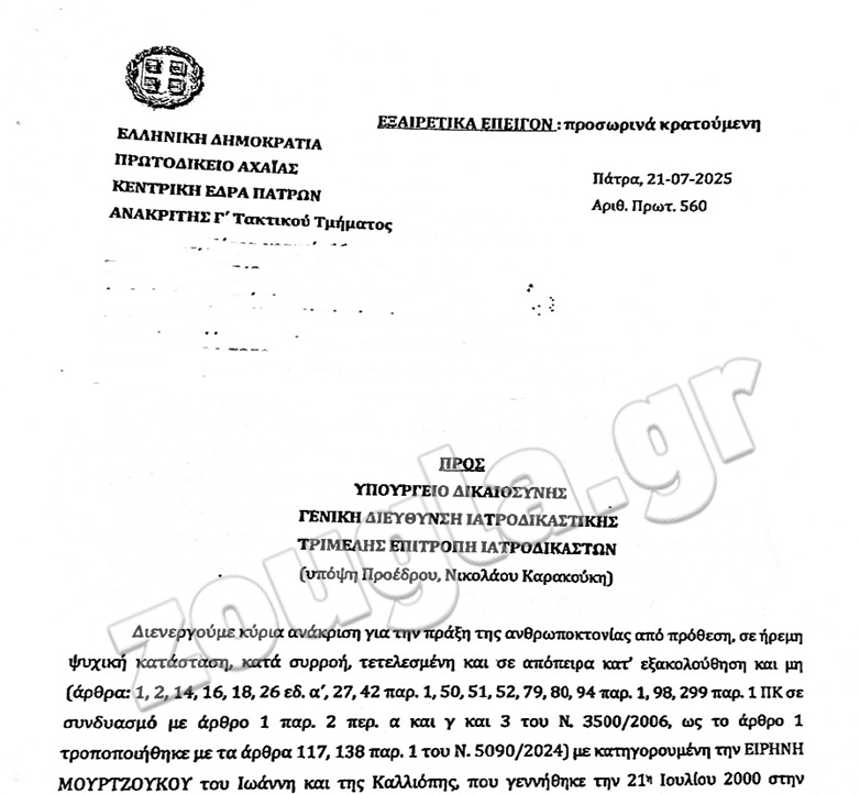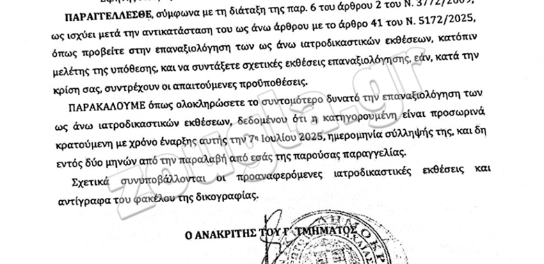«Παραγγέλλεσθε όπως προβείτε στην επαναξιολόγηση των τριών ιατροδικαστικών εκθέσεων, κατόπιν μελέτης της υπόθεσης και να συντάξετε σχετικές εκθέσεις επαναξιολόγησης, εάν, κατά την κρίση σας, συντρέχουν οι απαιτούμενες προϋποθέσεις. Παρακαλούμε όπως ολοκληρώσετε το συντομότερο δυνατό την επαναξιολόγηση των ιατροδικαστών εκθέσεων ,δεδομένου ότι η κατηγορούμενη είναι προσωρινά κρατούμενη με χρόνο έναρξης αυτής της 7ης Ιουλίου 2025, ημερομηνία σύλληψής της και δη εντός δύο μηνών από την παραλαβή από εσάς της παρούσας παραγγελίας».