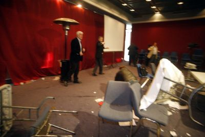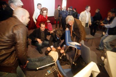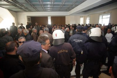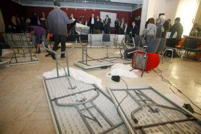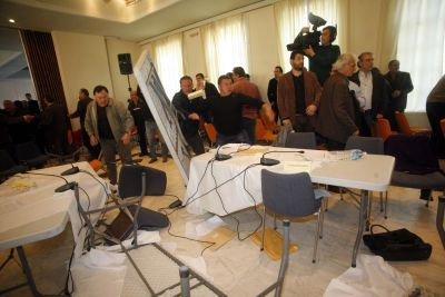Η ψηφοφορία δεν ολοκληρώθηκε ποτέ, ο κόσμος μπήκε άμεσα, αναποδογύρισε τραπέζια, πέταξε μπουκάλια με νερό, επικράτησε ένταση και χάος. Πληροφορίες αναφέρουν ότι ένας πολίτης τραυματίστηκε στο μάτι και έσπευσε ασθενοφόρο.
