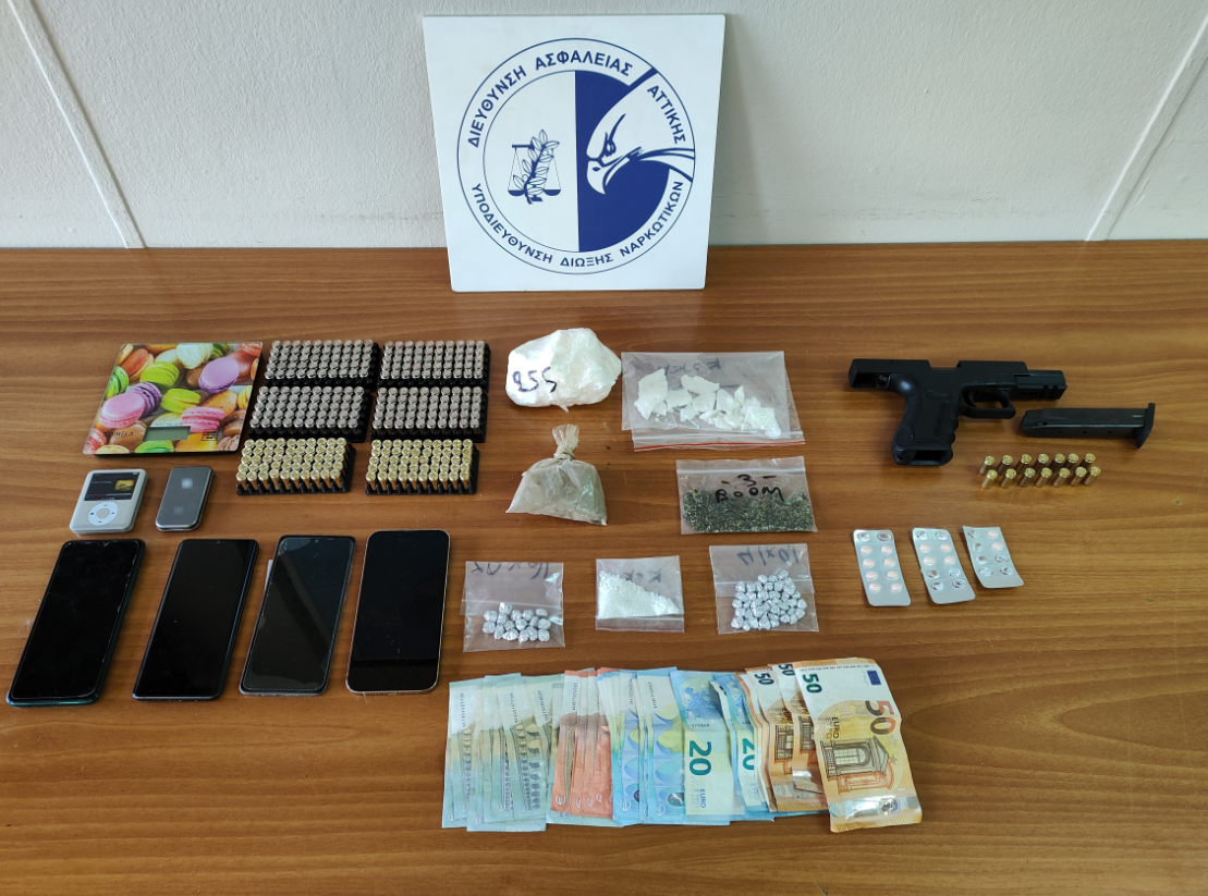 Συνολικά, πραγματοποιήθηκε έρευνα σε τέσσερα σπίτια όπου κατασχέθηκαν: 311,3 γραμμάρια κοκαΐνης, 3 γρ. συνθετικής κανναβινοειδούς ναρκωτικής ουσίας (BOOM), 166 γρ. καφέ σκόνη άγνωστης χημικής σύστασης, πλήθος νάιλον συσκευασιών για επιμερισμό ναρκωτικών ουσιών, 3 ηλεκτρονικές ζυγαριές ακριβείας, 14 φαρμακευτικά δισκία, πιστόλι με γεμιστήρα, 314 φυσίγγια, επιχειρησιακό αυτοκίνητο και το χρηματικό ποσό των 685 ευρώ.