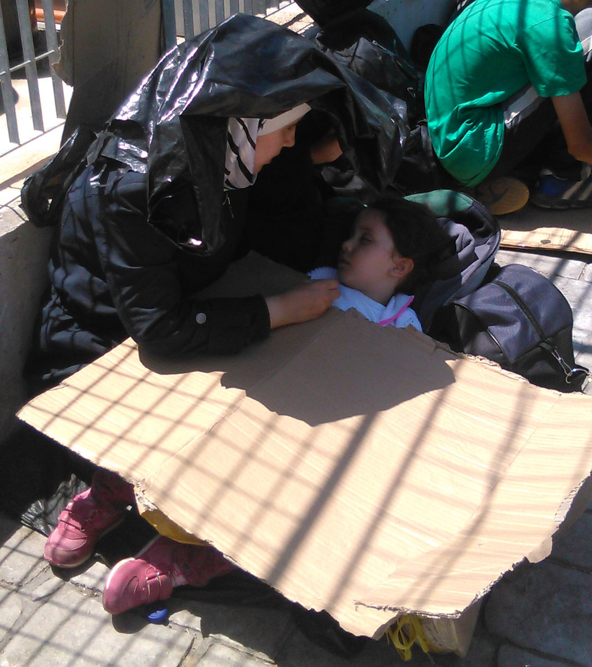 Οι πρόσφυγες, μεταξύ των οποίων και μικρά παιδιά, κοιμούνται ξαπλωμένοι στα πεζοδρόμια, προσπαθώντας να προφυλαχτούν από τον ήλιο με χαρτόκουτα.