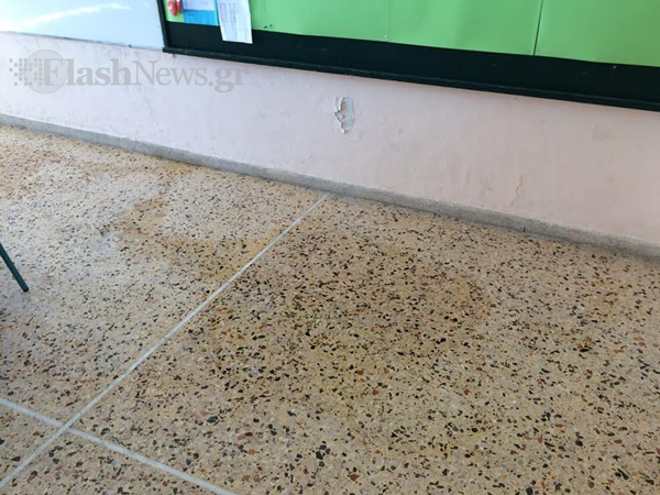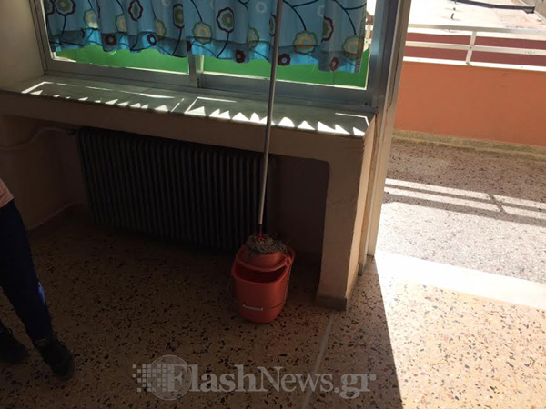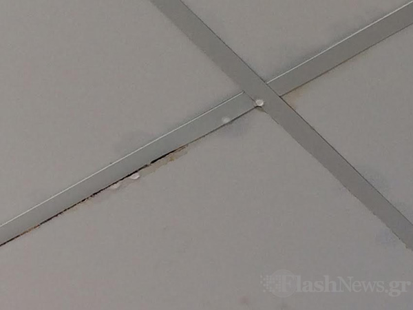 Παιδιά κάνουν μάθημα δίπλα σε… λίμνη από νερό που τρέχει από το ταβάνι, άγνωστο γιατί, ενώ καθημερινά, τα τελευταία δύο χρόνια οπότε και εμφανίστηκε το πρόβλημα, η δασκάλα σφουγγαρίζει την αίθουσα.