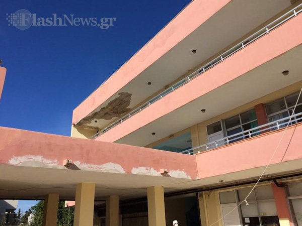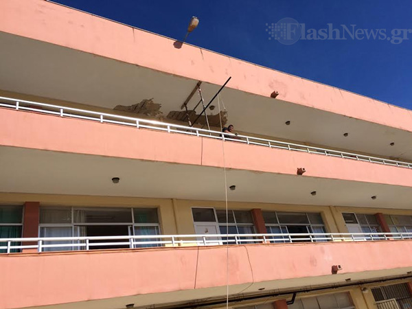 Εδώ και μερικές εβδομάδες, στο σχολικό συγκρότημα έχουν πέσει σοβάδες από την οροφή, τόσο μέσα στις αίθουσες όσο και στα μπαλκόνια.