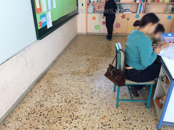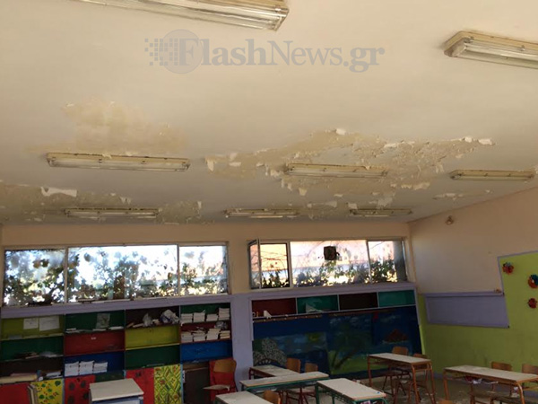 Παιδιά κάνουν μάθημα δίπλα σε… λίμνη από νερό που τρέχει από το ταβάνι, άγνωστο γιατί, ενώ καθημερινά, τα τελευταία δύο χρόνια οπότε και εμφανίστηκε το πρόβλημα, η δασκάλα σφουγγαρίζει την αίθουσα.