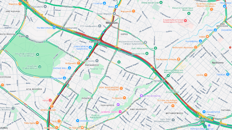 Από την διχάλα της Κηφισίας, όπου αριστερά μπαίνουμε για το κέντρο του Μαρουσίου, η ουρά των αυτοκινήτων φτάνει κάτω από τα σίδερα Χαλανδρίου.
