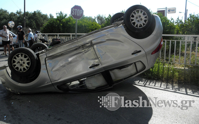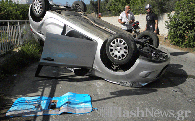 Η σύγκρουση, όπως αναφέρει το flashnews.gr, ήταν σφοδρή, με αποτέλεσμα το ασημί αυτοκίνητο να ανατραπεί.