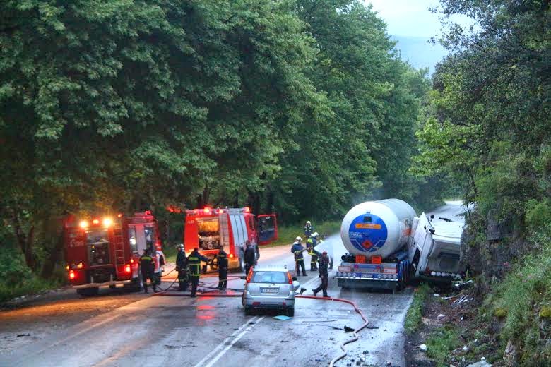Οδηγός βυτιοφόρου διανομής υγραερίου, έχασε τον έλεγχο του οχήματος εξ αιτίας της ολισθηρότητας του οδοστρώματος στην Εθνική Οδό Ιωαννίνων – Άρτας, με αποτέλεσμα να συγκρουστεί αρχικά με Ι.Χ. αυτοκίνητο και στη συνέχεια, να πέσει πάνω σε βράχια.