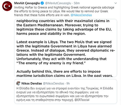 Επίσης, ο Τσαβούσογλου ανέφερε πως η πρόσφατη επίσκεψη του Χαλίφα Χαφτάρ στην Αθήνα έγινε με σκοπό τη δολιοφθορά της ειρήνης στη Λιβύη.