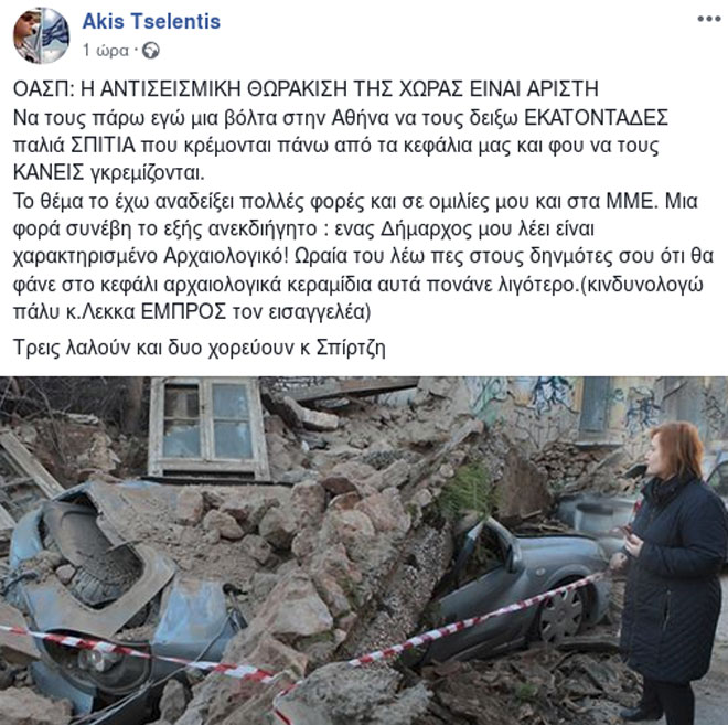 Με ανάρτηση στο προφίλ του στο Facebook ο Ακης Τσελέντης σχολιάζει την διαβεβαίωση του Οργανισμού Αντισεισμικής Προστασίας πως «η αντισεισμική θωράκιση της χώρας είναι άριστη» και συνεχίζει «προσκαλώντας» τους ιθύνοντες σε μια βόλτα στην Αθήνα, όπου «εκατοντάδες παλιά σπίτια κρέμονται πάνω από τα κεφάλια μας και φου να τους κάνεις, γκρεμίζονται».