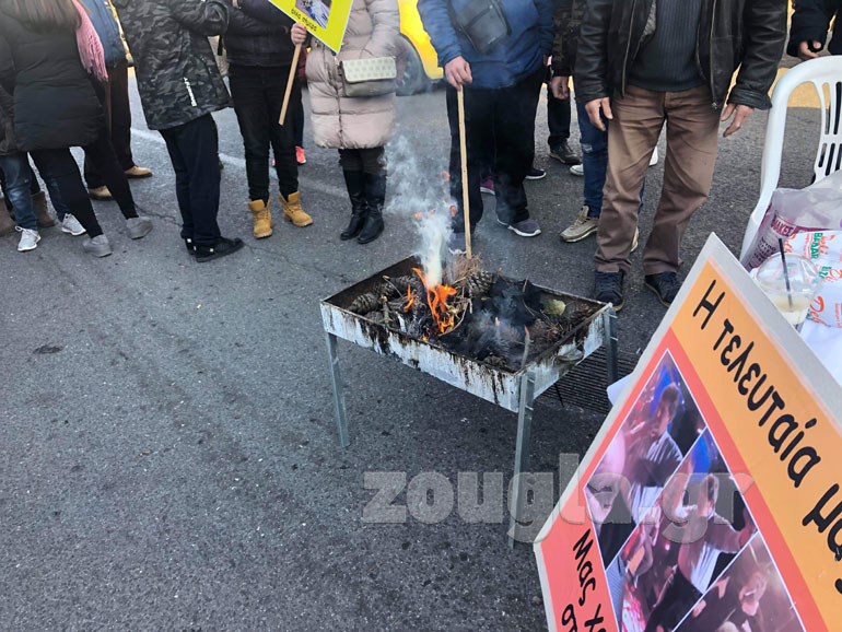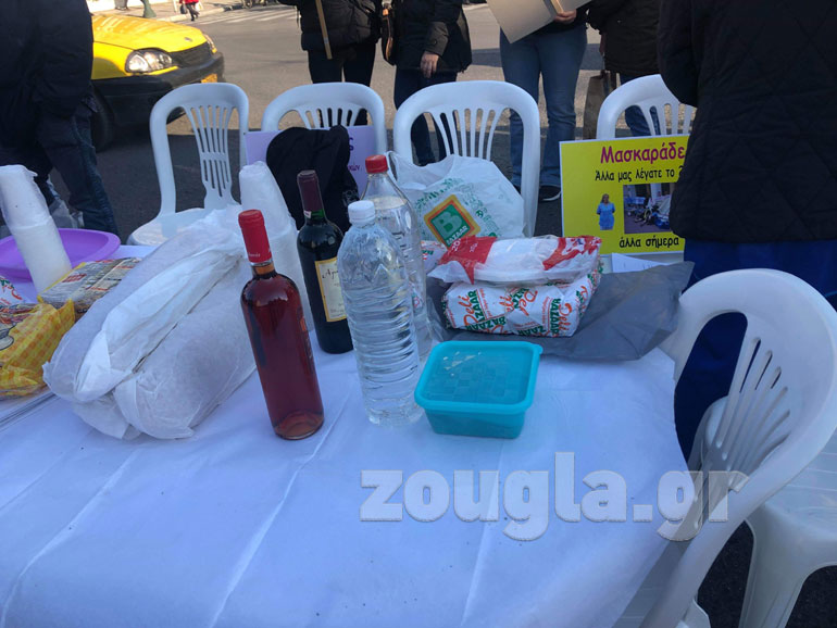 Τα μέλη της ΠΟΕΔΗΝ έχουν τοποθετήσει στην άκρη του δρόμου της Βασιλίσσης Σοφίας ψησταριές, όπου θα ψήσουν σουβλάκια, και δίπλα ένα τραπέζι με κρασιά και αποκριάτικα εδέσματα.