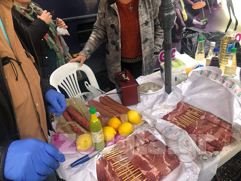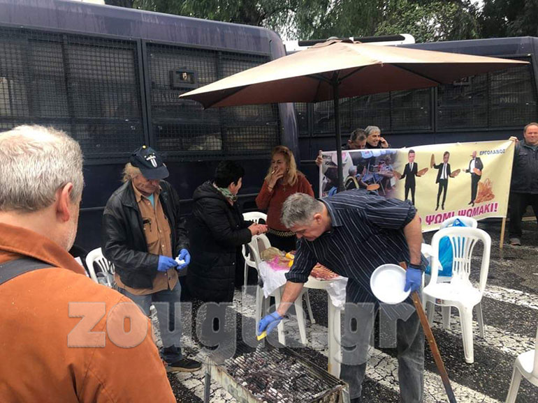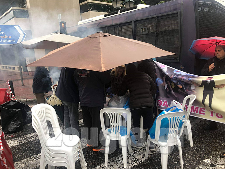 Στη συμβολή της Βασιλίσσης Σοφίας με την οδό Ηρώδου Αττικού, λίγα μέτρα μακριά από το Μέγαρο Μαξίμου, βρίσκονται μέλη της ΠΟΕΔΗΝ και καθαρίστριες από το Δρομοκαΐτειο ψήνοντας σουβλάκια και λουκάνικα μπροστά από τις κλούβες των ΜΑΤ.