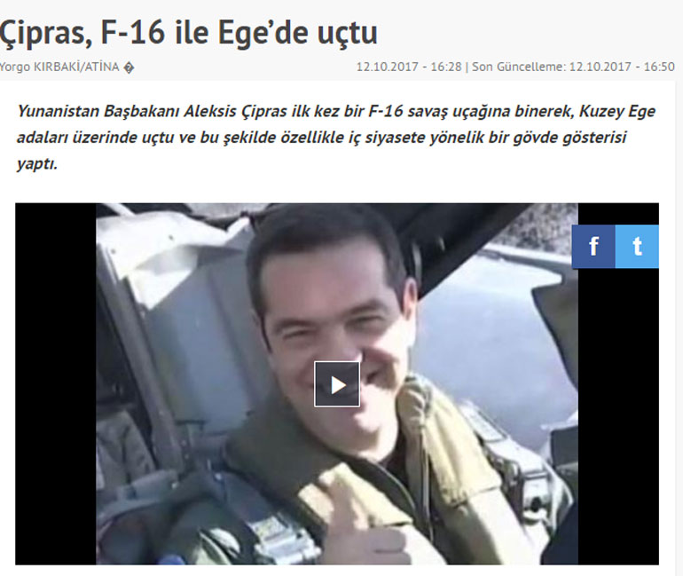 Δεν πρόλαβε να προσγειωθεί το F- 16 με τον Έλληνα πρωθυπουργό στη θέση του συγκυβερνήτη και η εφημερίδα Hurriyet ανάρτησε στο πρωτοσέλιδο της ηλεκτρονικής της έκδοσης την είδηση ως εξής: