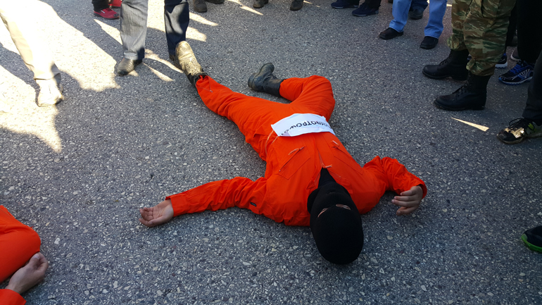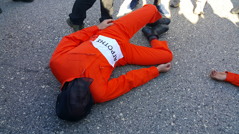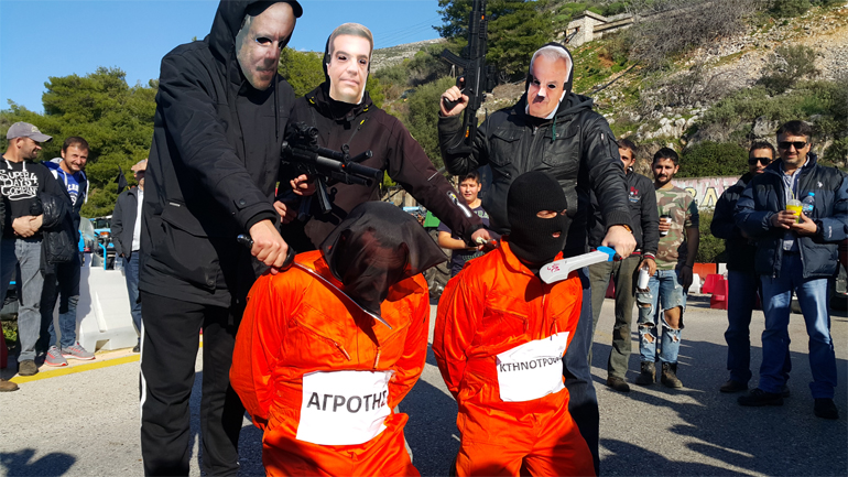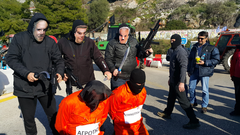 «Εμπνευσμένοι» από τις αποτρόπαιες εκτελέσεις των τζιχαντιστών του Ισλαμικού Χαλιφάτου, οι αγρότες… υποδύθηκαν«δήμιους» πολιτικούς (σ.σ.: φορώντας μάσκες των ΑλέξηΤσίπρα, Βαγγέλη Αποστόλου και Γιώργου Κατρούγκαλου) και «αποκεφάλισαν» έναν γεωργό και έναν κτηνοτρόφο.