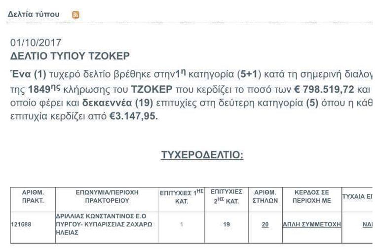 Έτσι από την πρώτη κατηγορία κερδίζει το ποσό των 798.519€ καθώς και περίπου 60.000€ ακόμα από τα 19 5άρια, αφού το καθένα κερδίζει από 3.147€.