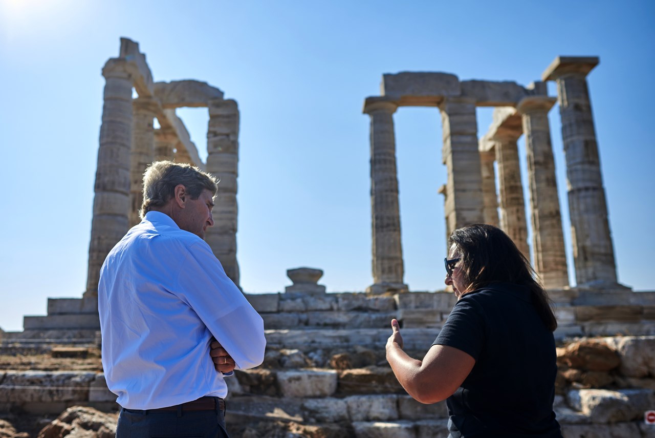 «Αυτή η εκπληκτική τοποθεσία, που είναι 2.500 ετών, είναι μια υπενθύμιση σε όλους μας, από όποια χώρα του πλανήτη και αν προερχόμαστε, της εξαιρετικής σχέσης που έχουμε όλοι με την πολιτιστική ιστορία μας και τη φυσική ιστορία μας, όπως εμφανίζονται και εδώ» δήλωσε ο Ειδικός Απεσταλμένος του Προέδρου των ΗΠΑ για το Κλιμα, Τζον Κέρι, κατά την επίσκεψή του στον Ναό του Ποσειδώνα στο Σούνιο, την Κυριακή.