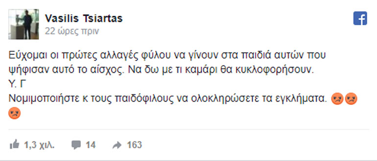 Συγκεκριμένα ο πρώην ποδοσφαιριστής έγραψε χθες στο προφίλ του: «Εύχομαι οι πρώτες αλλαγές φύλου να γίνουν στα παιδιά αυτών που ψήφισαν αυτό το αίσχος. Να δω με τι καμάρι θα κυκλοφορήσουν» και συμπλήρωσε: «Νομιμοποιήστε κ τους παιδόφιλους να ολοκληρώσετε τα εγκλήματα».