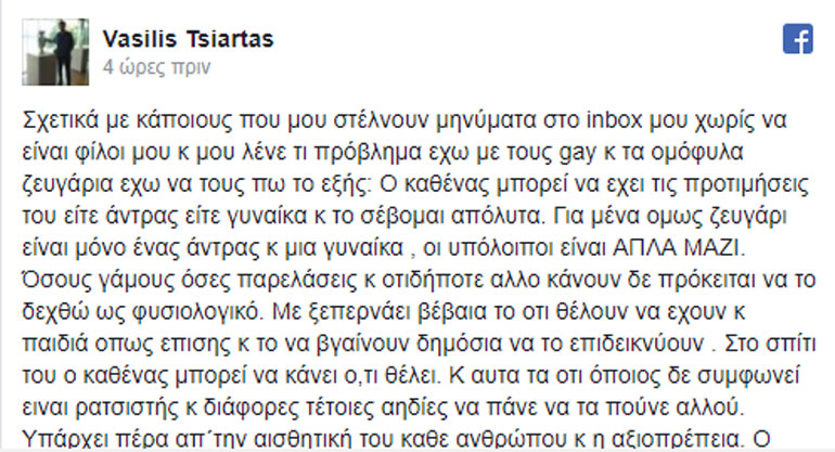 «Σχετικά με κάποιους που μου στέλνουν μηνύματα στο inbox μου, χωρίς να είναι φίλοι μου και μου λένε τι πρόβλημα έχω με τους gay και τα ομόφυλα ζευγάρια, έχω να τους πω το εξής: Ο καθένας μπορεί να έχει τις προτιμήσεις του είτε άντρας είτε γυναίκα και το σέβομαι απόλυτα. Για μένα όμως ζευγάρι είναι μόνο ένας άντρας και μία γυναίκα , οι υπόλοιποι είναι ΑΠΛΑ ΜΑΖΙ. Όσους γάμους, όσες παρελάσεις και ο,τιδήποτε άλλο κάνουν, δεν πρόκειται να το δεχθώ ως φυσιολογικό. Με ξεπερνάει βέβαια το ότι θέλουν να έχουν και παιδιά, όπως επίσης και το να βγαίνουν δημόσια να το επιδεικνύουν. Στο σπίτι του ο καθένας μπορεί να κάνει ο,τι θέλει. Και αυτά τα ότι όποιος δε συμφωνεί είναι ρατσιστής και διάφορες τέτοιες αηδίες, να πάνε να τα πούνε αλλού. Υπάρχει πέρα απ´την αισθητική του κάθε ανθρώπου και η αξιοπρέπεια. Ο Θεός έπλασε τον Αδάμ και την Εύα. Τα υπόλοιπα κατασκευάστηκαν για κατανάλωση», ήταν τα λόγια του.