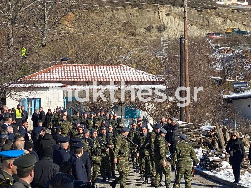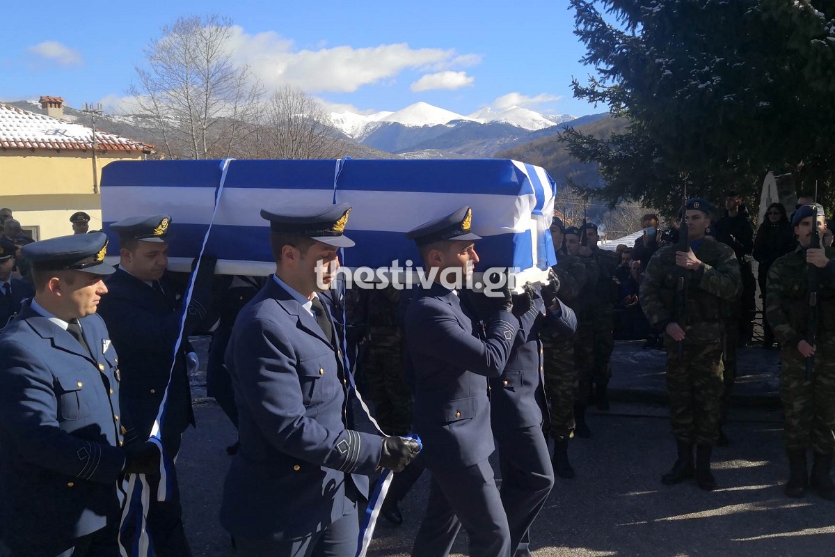 Πριν από λίγο, η σορός του κυβερνήτη έφτασε στην εκκλησία και σε λίγο θα ξεκινήσει η εξόδιος ακολουθία. Τη σορό μεταφέρουν συνάδελφοι του σμηναγού Τσιτλακίδη. Πιλότος από την ίδια μονάδα κρατούσε το πιλίκιο και το ξίφος.