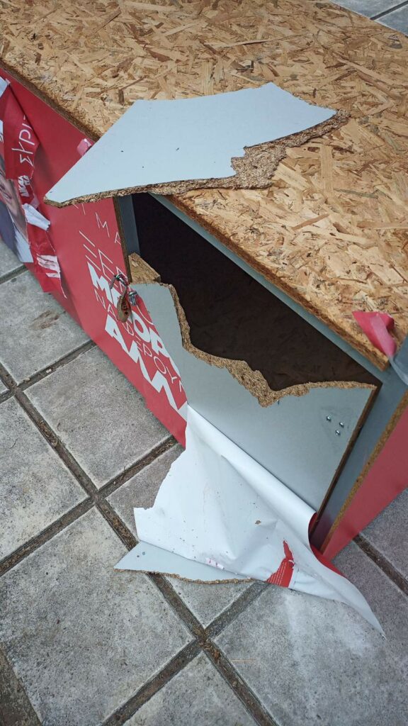 Όπως φαίνεται και στις φωτογραφίες, ομάδα ατόμων έσπασε σημεία του περιπτέρου, έσκισε αφίσες και κόλλησε αυτοκόλλητα. Στελέχη του ΣΥΡΙΖΑ-ΠΣ ενημέρωσαν τις αστυνομικές αρχές, οι οποίες αναμένεται να ερευνήσουν το περιστατικό.