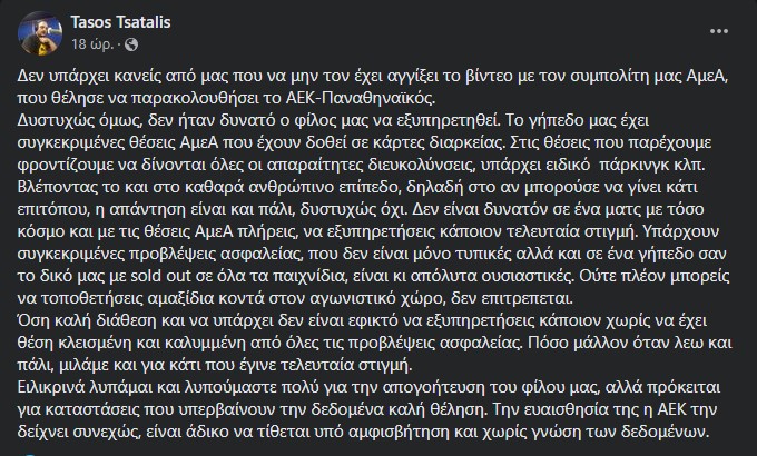 Θέση για το περιστατικό πήρε με ανάρτησή του ο υπεύθυνος Τύπου της ΠΑΕ ΑΕΚ, Τάσος Τσατάλης και εξήγησε πως οι θέσεις ΑμεΑ ήταν πλήρεις και πως παρόλη την καλή διάθεση, δεν κατέστη δυνατό να εξυπηρετηθεί ο εν λόγω φίλος της ομάδας για λόγους ασφαλείας.