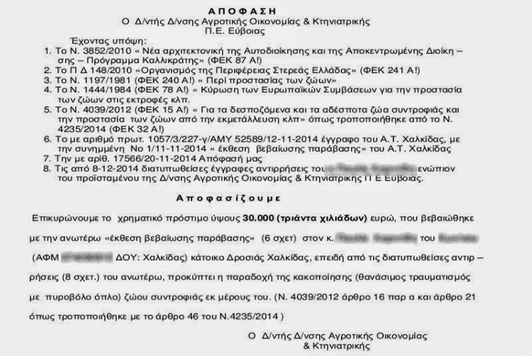 Χρηματικό πρόστιμο ύψους 30.000 ευρώ επικυρώθηκε σε κάτοικο της περιοχής «Δροσιά» της Χαλκίδας για τη δολοφονία ζώου συντροφιάς.