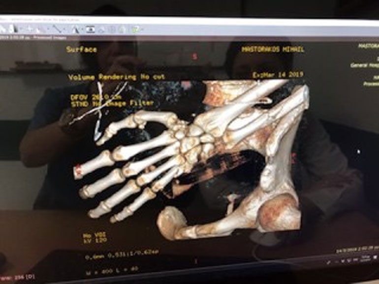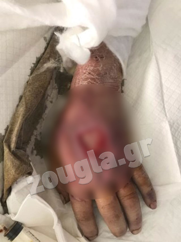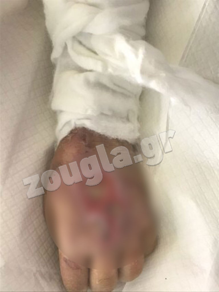 – Φέρει κάταγμα ωλένης αριστερού άνω άκρου. Το χέρι φαίνεται να είναι δαγκωμένο σε διάφορα σημεία, ενώ είναι χτυπημένο μέχρι τον αγκώνα και έχει τρύπα. Παράλληλα, έχουν καταστραφεί τένοντες και έλυτρα με κίνδυνο να χρειαστεί ακρωτηριασμό.