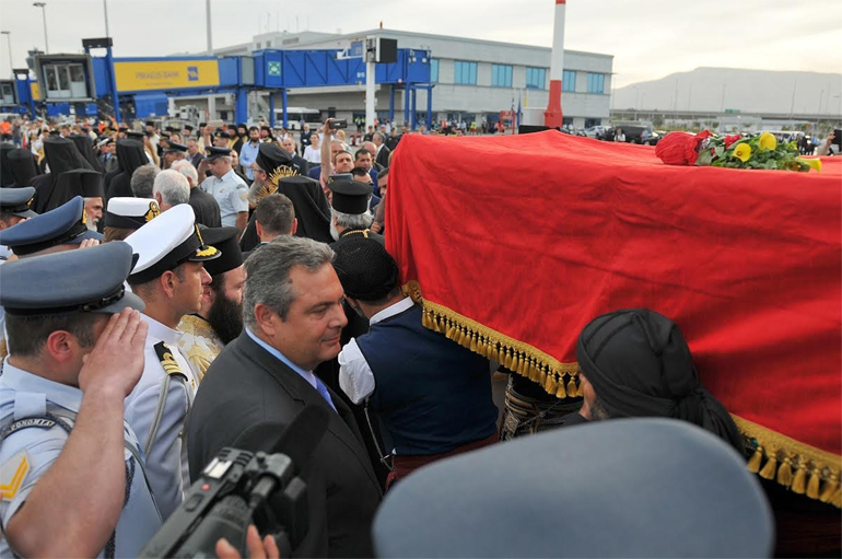 Στην υποδοχή στον Διεθνή Αερολιμένα Αθηνών το παρών έδωσε ο υπουργός Εθνικής Άμυνας Πάνος Καμμένος. Μαζί με το Ιερό Λείψανο της Αγίας Ελένης, μεταφέρθηκε και τμήμα του Τιμίου Ξύλου.