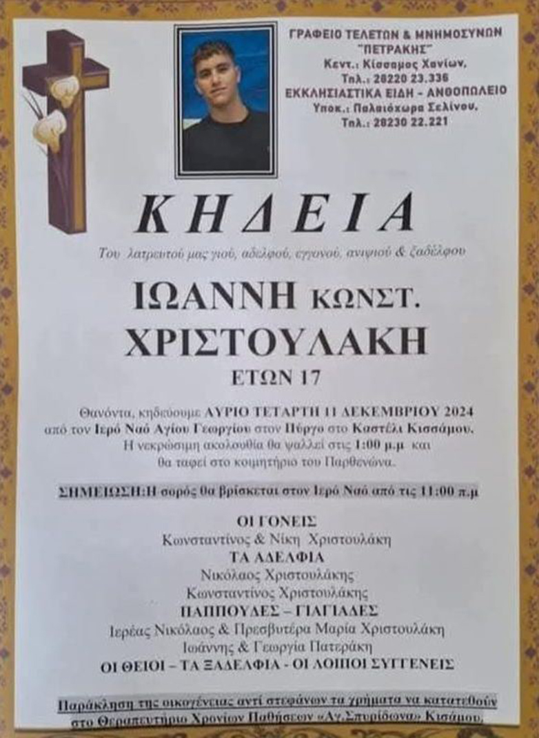 Πριν δύο ημέρες έγινε η κηδεία Γιάννη Χριστουλάκη, ο οποίος σκοτώθηκε σε ηλικία μόλις 17 ετών, ύστερα από σφοδρό τροχαίο στην Οδό Ηρώων Πολυτεχνείου, στο Καστέλλι Κισσάμου, την 23η Νοεμβρίου. Ο ανήλικος κατά την πτώση του, υπέστη κρανιοεγκεφαλικές κακώσεις και αρχικά διακομίσθηκε στο Κέντρο Υγείας Κισάμου για τις πρώτες βοήθειες ενώ στην συνέχεια μεταφέρθηκε στο Νοσοκομείο Χανίων, όπου παρέμεινε διασωληνωμένος, δίνοντας μία σκληρή μάχη για να κρατηθεί στη ζωή. Ο άτυχος έφηβος έδινε «μάχη» να κρατηθεί στη ζωή για δεκαέξι ολόκληρες μέρες στη Μονάδα Εντατικής Θεραπείας του νοσοκομείου Χανίων, μέχρι τελικώς να εκπνεύσει.
