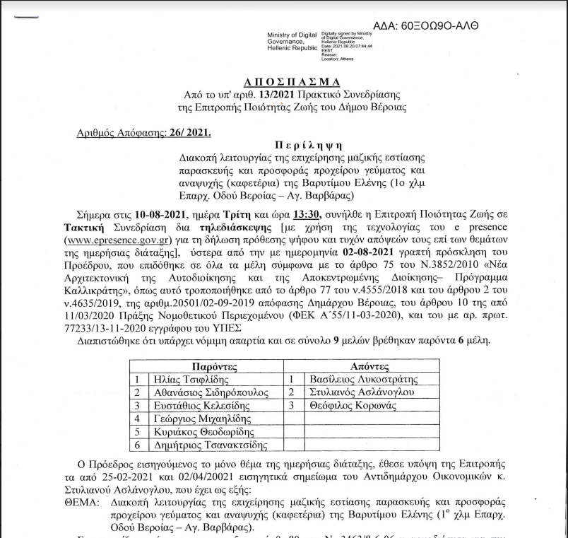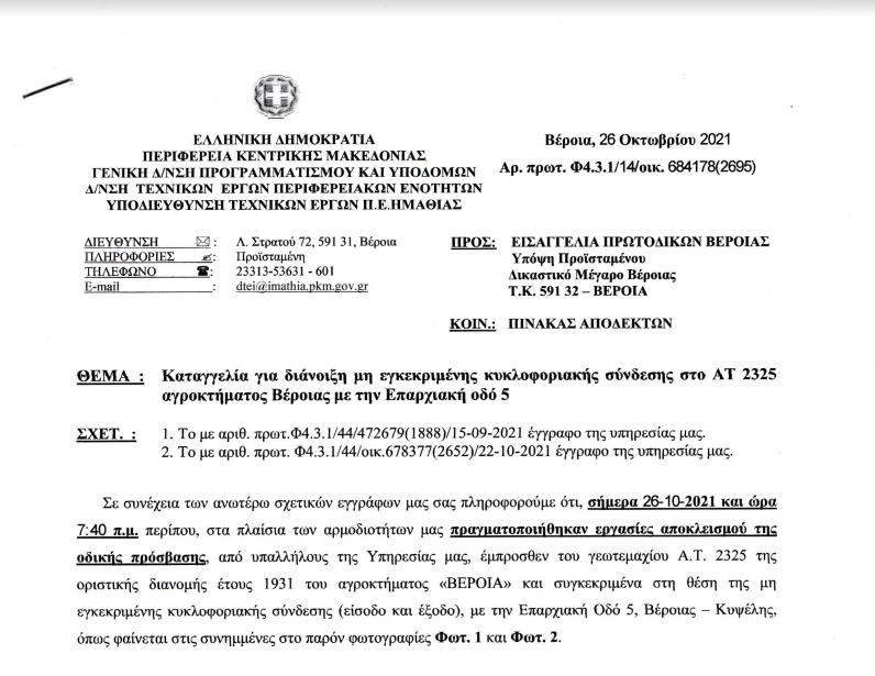 Την παράνομη συνέχιση λειτουργίας επιχείρησης μαζικής εστίασης, παρασκευής και προσφοράς προχείρου γεύματος και αναψυχής στην Επαρχιακή Οδό Βέροιας καταγγέλλει αναγνώστης στο zougla.gr, παραθέτοντας τα σχετικά έγγραφα και αποφάσεις.