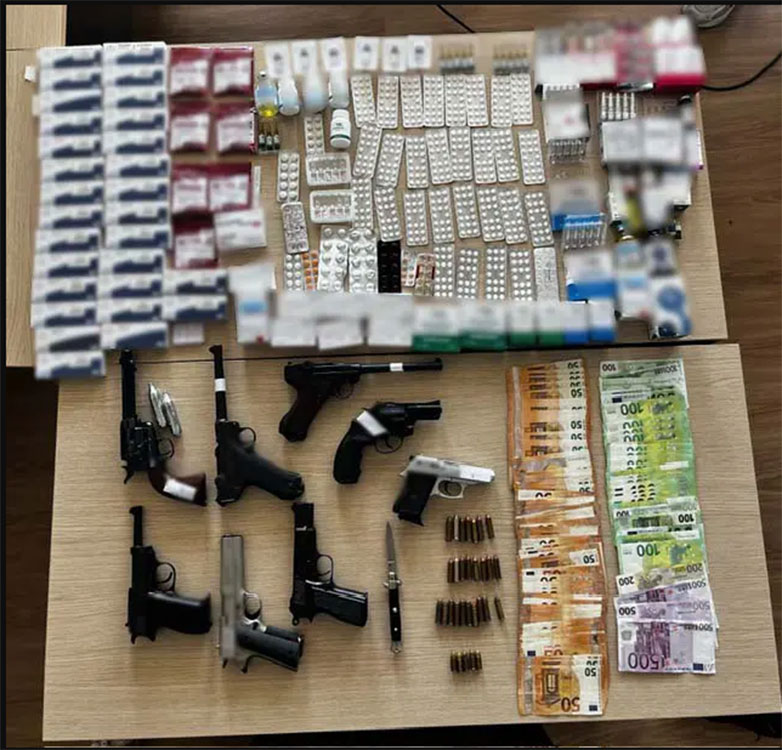 -7- πιστόλια κρότου- λάμψης, αεροβόλο περίστροφο με -2- αμπούλες, -30- φυσίγγια πυροβόλου όπλου, διαφόρων διαμετρημάτων, μαχαίρι-στιλέτο, -2- κινητά τηλέφωνα, ιδιόχειρες σημειώσεις και -9.250- ευρώ.