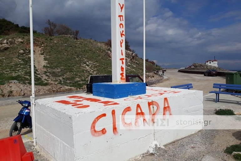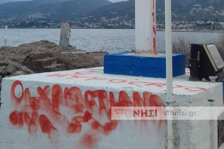 Έναν χρόνο και λίγες ημέρες μετά την τοποθέτηση του γιγάντιου σταυρού στην περιοχή Απέλη Μυτιλήνης, άγνωστοι έβαψαν με μπογιές τον σταυρό, σημείωσαν «υποκρισία» με κόκκινη μπογιά στα ελληνικά, πάνω στον σταυρό και στα λατινικά πάνω στην ελληνική σημαία.