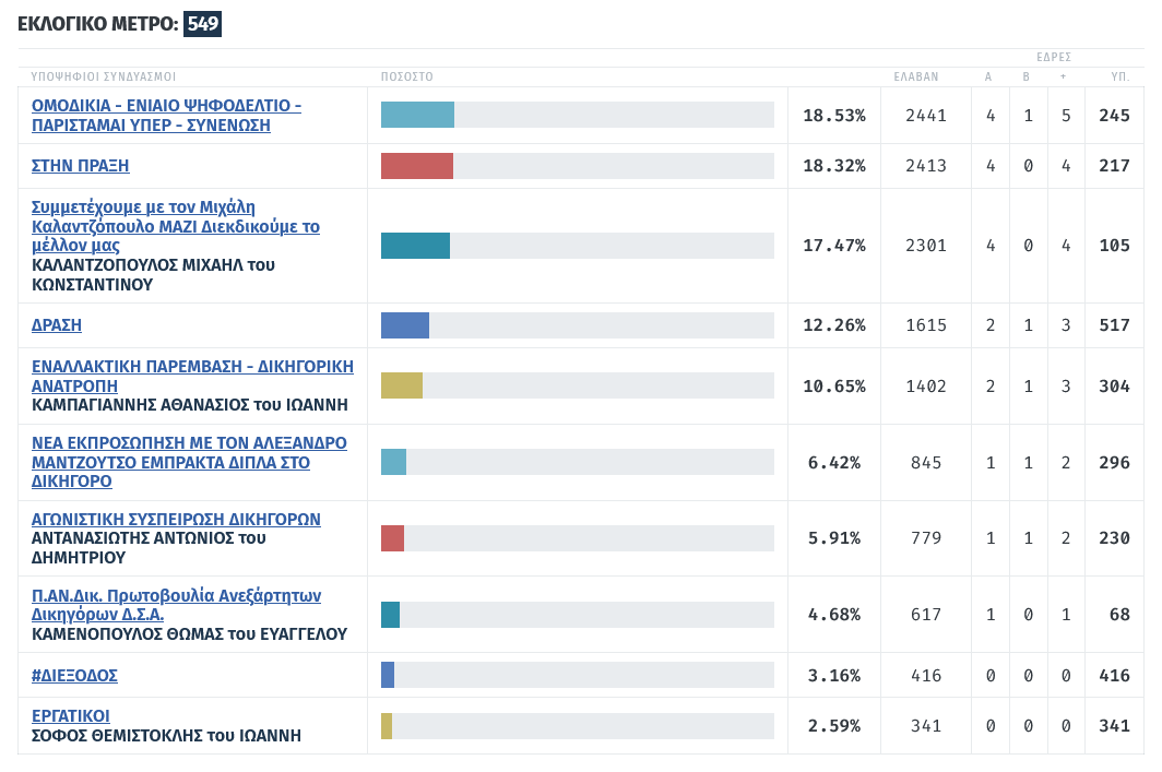 Στις εκλογές ψήφισαν 13818 Δικηγόροι. Έγκυρα ήταν 13405. , άκυρα 200, ενώ βρέθηκαν και 213 Λευκά Ψηφοδέλτια.