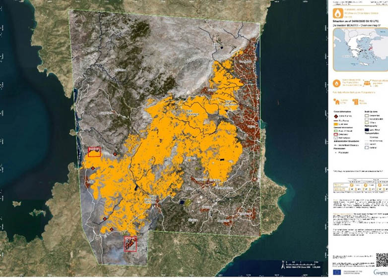 Σύμφωνα με τα δεδομένα και τους χάρτες της Υπηρεσίας Copernicus Emergency Management Service/Mapping υπολογίζεται ότι από την καταστροφική πυρκαγιά στο νησί, επλήγησαν 47.765 στρέμματα γης, ανάμεσά τους μαστιχόδεντρα και ελαιόδεντρα.