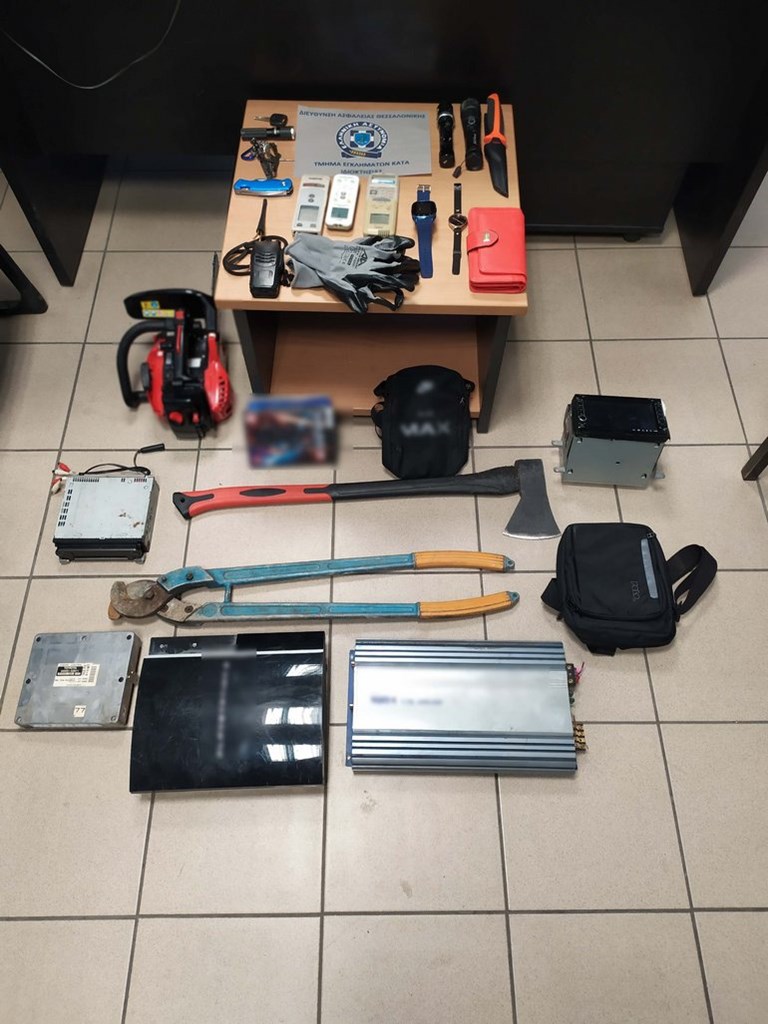 Σε έρευνες που πραγματοποιήθηκαν στις οικίες τους στην περιοχή των Διαβατών βρέθηκαν μεταξύ άλλων και κατασχέθηκαν, ασύρματοι πομποδέκτες συντονισμένοι με τη συχνότητα της αστυνομίας, ηλεκτρονικοί εγκέφαλοι αυτοκινήτων, τους οποίους χρησιμοποιούσαν για την κλοπή των οχημάτων, διαρρηκτικά εργαλεία και πλήθος κλοπιμαίων.