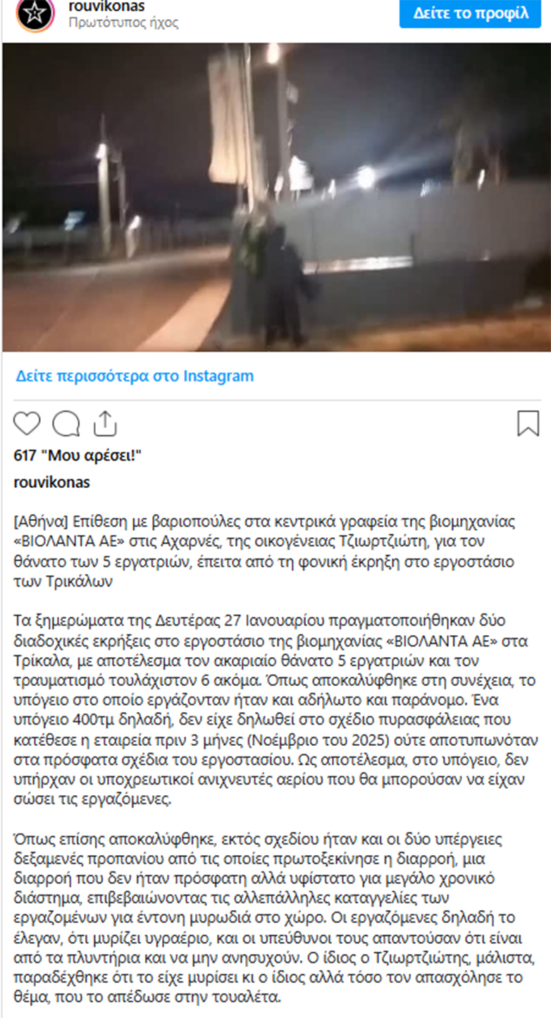 Τα ξημερώματα της Δευτέρας 27 Ιανουαρίου πραγματοποιήθηκαν δύο διαδοχικές εκρήξεις στο εργοστάσιο της βιομηχανίας «ΒΙΟΛΑΝΤΑ ΑΕ» στα Τρίκαλα, με αποτέλεσμα τον ακαριαίο θάνατο 5 εργατριών και τον τραυματισμό τουλάχιστον 6 ακόμα. Όπως αποκαλύφθηκε στη συνέχεια, το υπόγειο στο οποίο εργάζονταν ήταν και αδήλωτο και παράνομο. Ένα υπόγειο 400τμ δηλαδή, δεν είχε δηλωθεί στο σχέδιο πυρασφάλειας που κατέθεσε η εταιρεία πριν 3 μήνες (Νοέμβριο του 2025) ούτε αποτυπωνόταν στα πρόσφατα σχέδια του εργοστασίου. Ως αποτέλεσμα, στο υπόγειο, δεν υπήρχαν οι υποχρεωτικοί ανιχνευτές αερίου που θα μπορούσαν να είχαν σώσει τις εργαζόμενες.