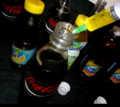 Από την εξέταση που διενεργήθηκε στο περιεχόμενο των φιαλών, από τις αρμόδιες Κρατικές Υπηρεσίες, προέκυψε ότι εμπεριέχουν αναψυκτικό με ποσότητα υδροχλωρικού οξέως.